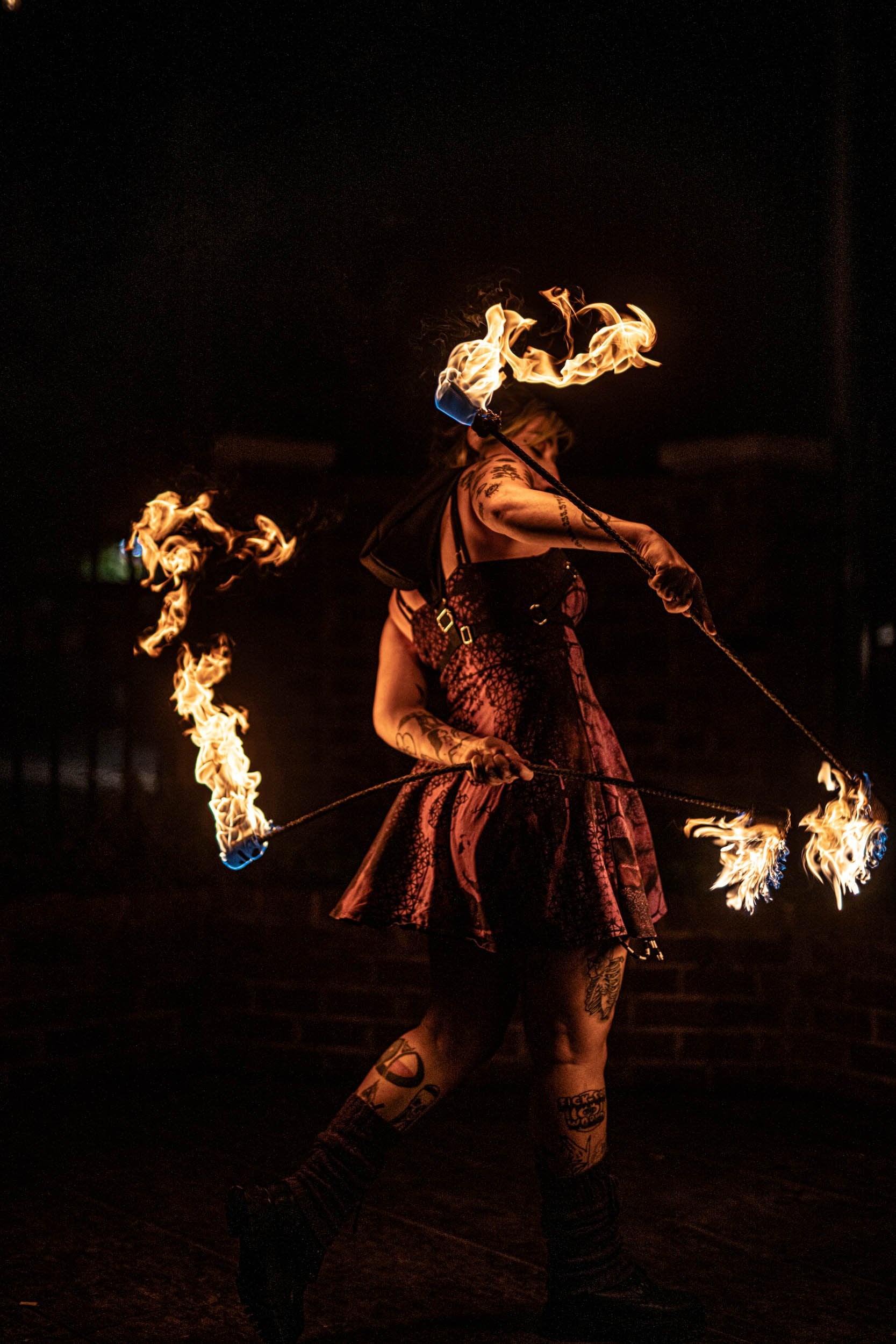 A double-staff fire prop with a playful bouncing, wiggling effect, creating an exaggerated, cartoon-like motion while spinning.